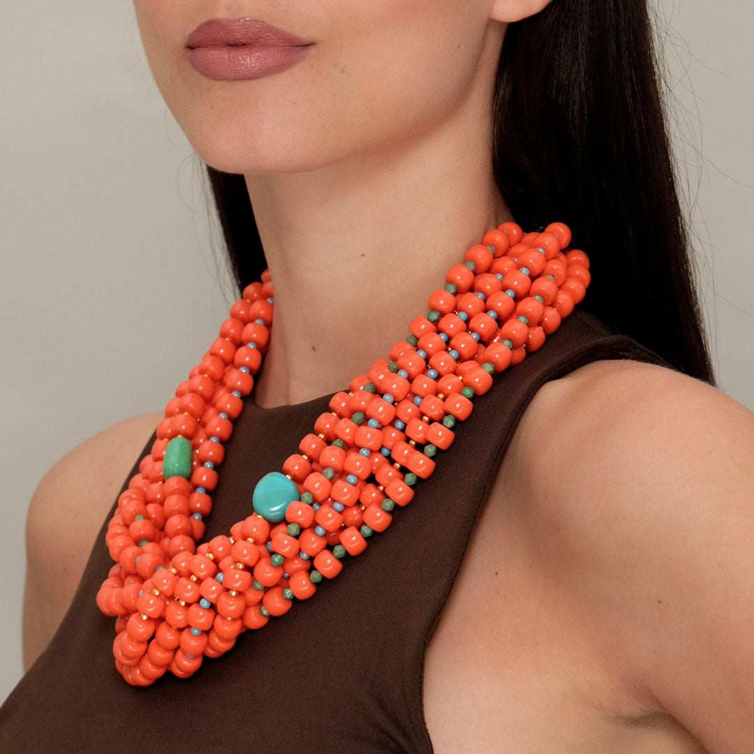 Multi-strand choker necklace made with coral and turquoise resin beads and gold-plated brass inserts. A jewel that recalls the liveliness of summer to wear whenever you want to add a touch of joy to your days.