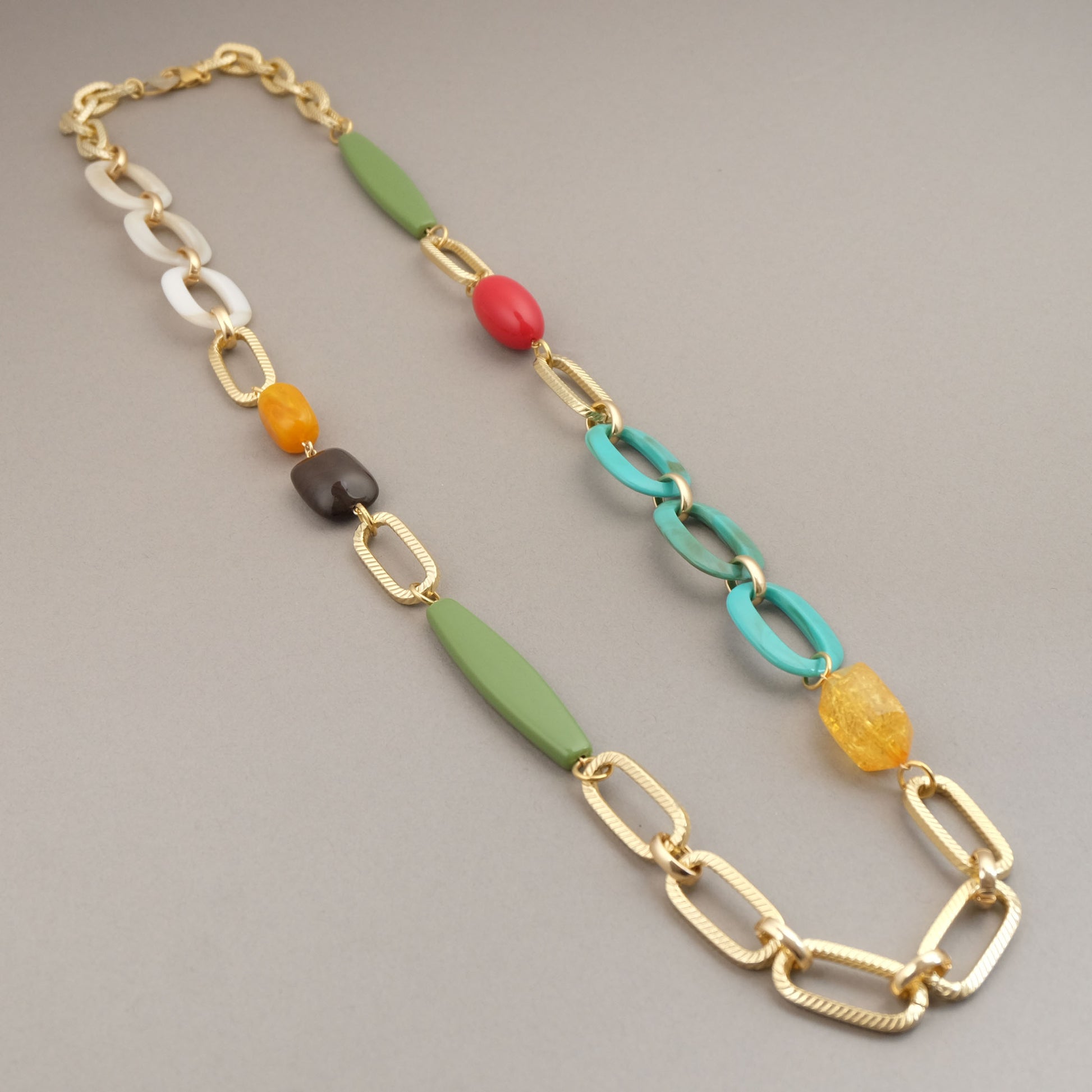 Collana lunga con elementi in resina di colore verde, turchese, bianco, rosso, nero, ambra ed inserti in ottone, alluminio ed acciaio. Un gioiello ricco di colore e forme che si presta anche ad essere indossata con un doppio giro a seconda delle tue necessità e per rendere unici i tuoi look.