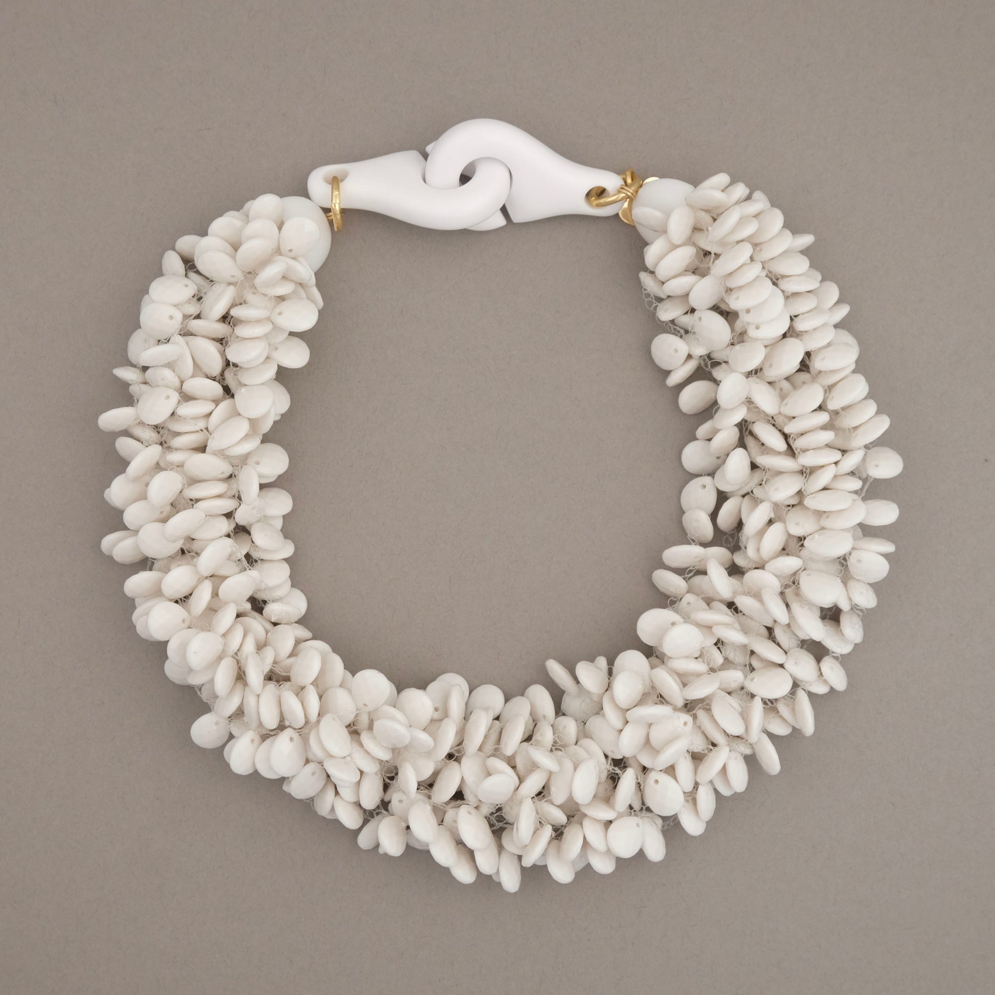 Multi-strand choker necklace made with white resin stones in the shape of a drop and gold-plated brass inserts. An entirely white jewel to give even more of a touch of shine and sparkle to your outfits.