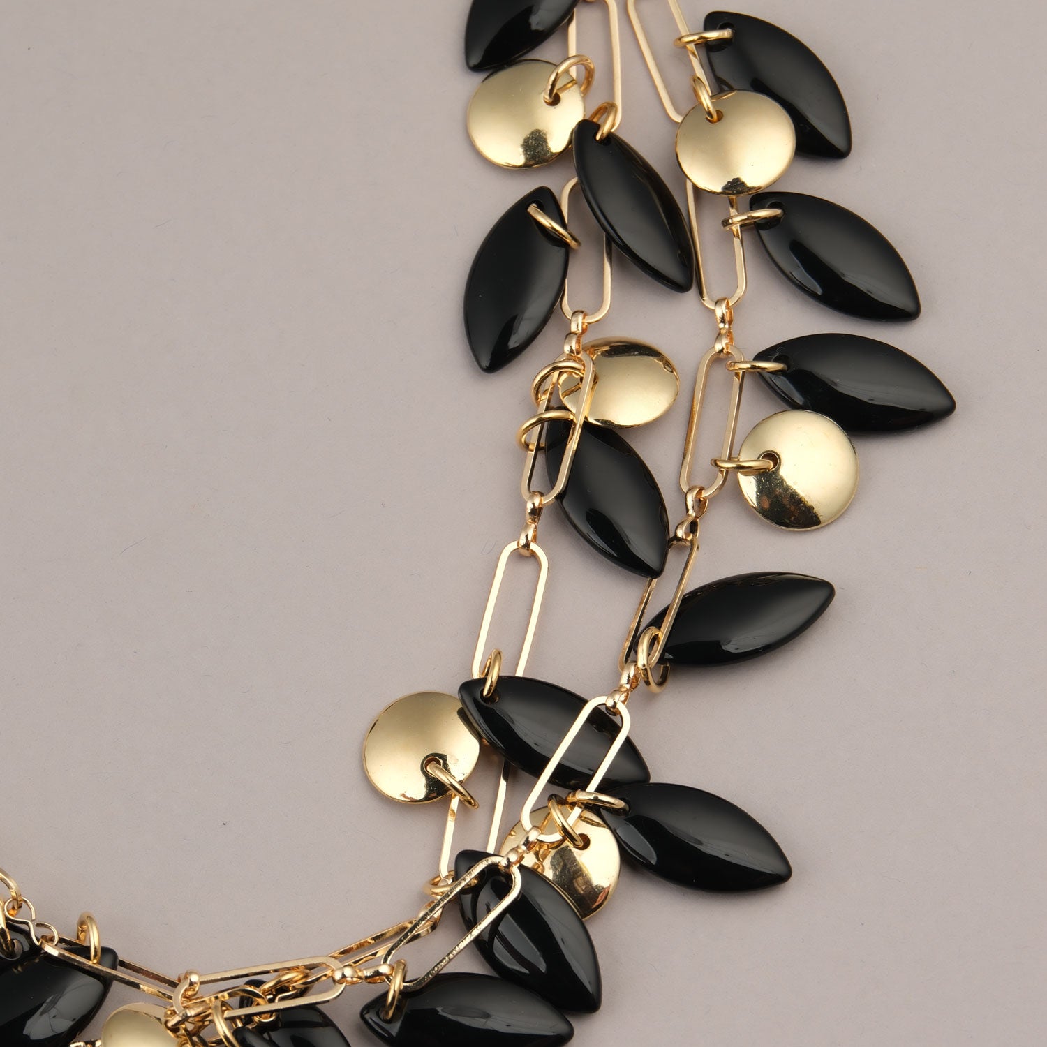 Collana lunga con elementi in resina a forma di petali e dal colore nero con inserti in ottone ed acciaio. Un monile elegante per rendere raffinato ogni tuo look.