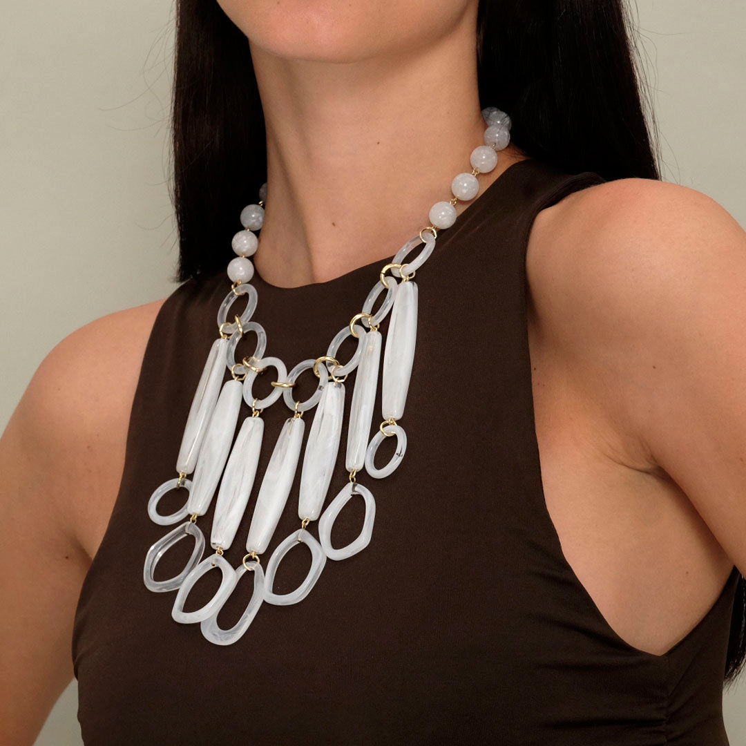 Collana girocollo con elementi in resina bianca ed inserti in ottone, alluminio e acciaio. Un gioiello unico per le tue occasioni speciali.