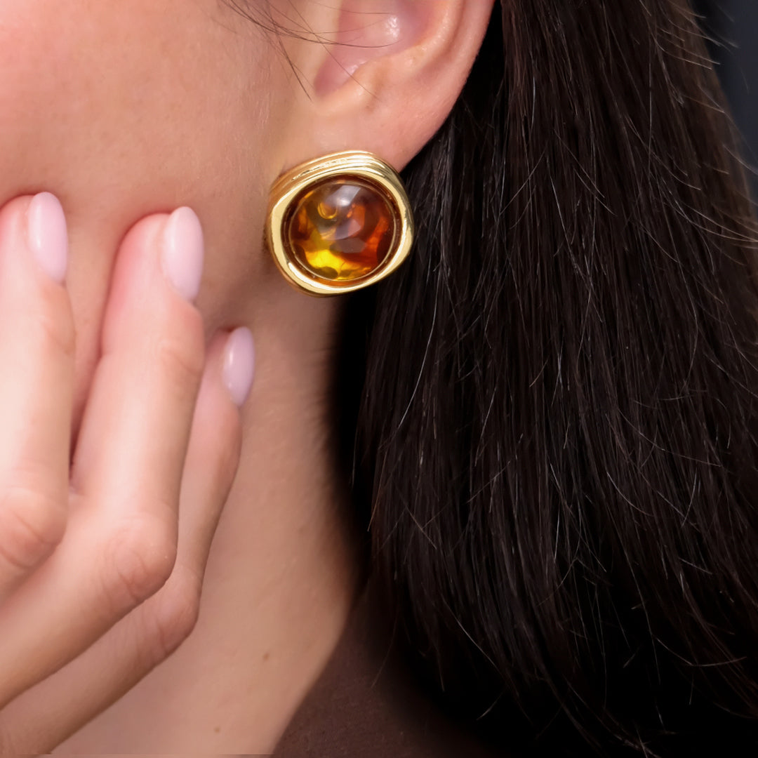 Orecchini a lobo in ottone placcato oro ed inserto con resina cabochon di colore ambra. Un gioiello colorato e versatile per divertirti a creare abbinamenti perfetti con i tuoi outfit.
