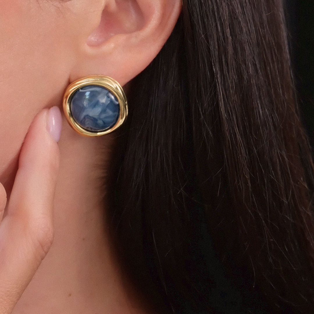 Orecchini a lobo in ottone placcato oro ed inserto con resina cabochon di colore blu. Un gioiello colorato e versatile per divertirti a creare abbinamenti perfetti con i tuoi outfit.