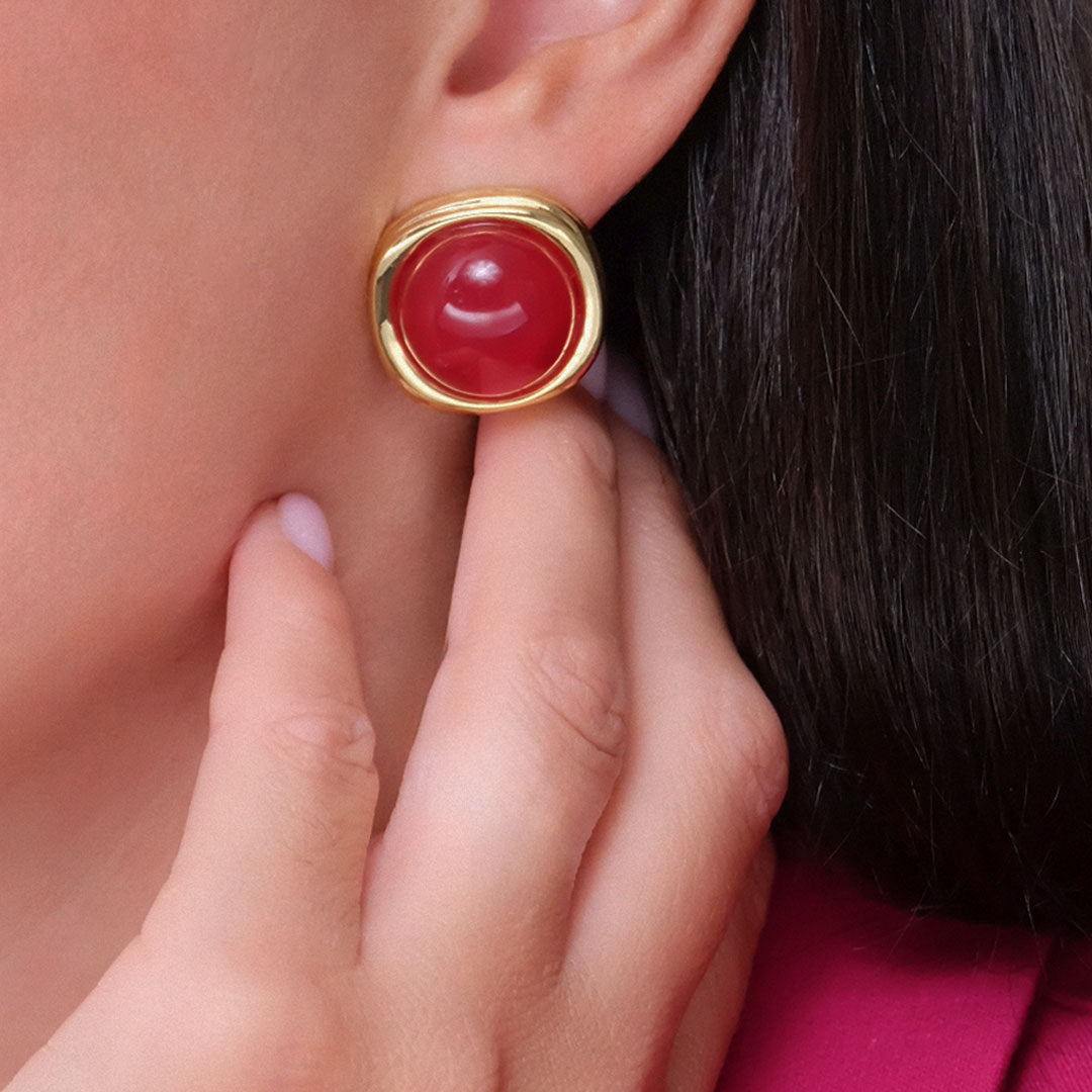 Orecchini a lobo in ottone placcato oro ed inserto con resina cabochon di colore magenta. Un gioiello colorato e versatile per divertirti a creare abbinamenti perfetti con i tuoi outfit.