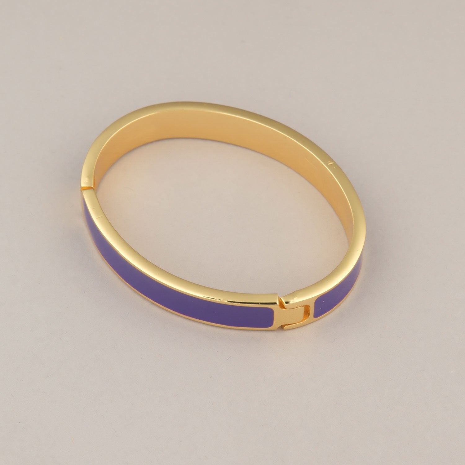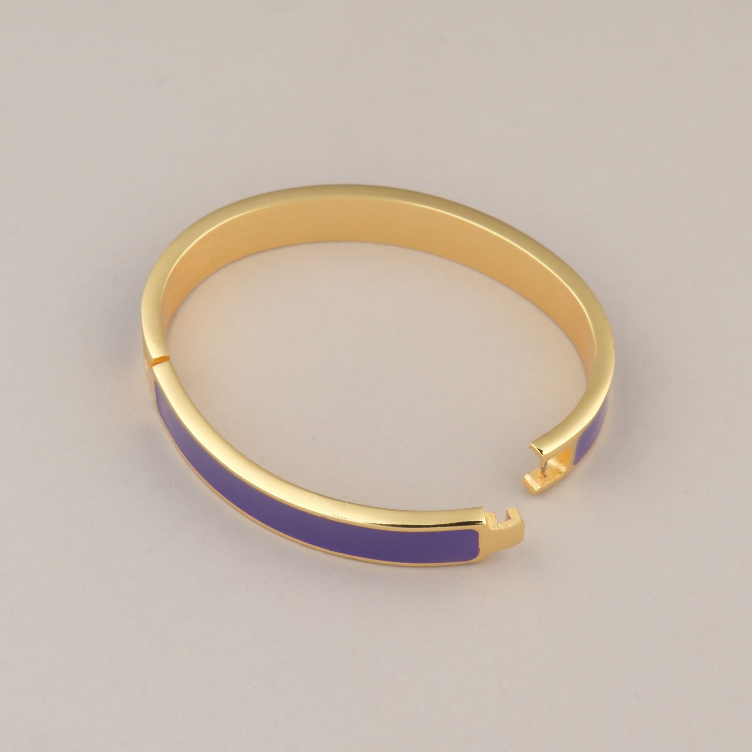 Bracciale a fascia realizzato a mano in ottone placcato oro 24 carati e smalto a freddo di colore viola con finitura trasparente. La fusione perfetta tra eleganza contemporanea e artigianato tradizionale. Lasciati affascinare dal design elegante ed i dettagli raffinati di un gioiello che sarà il complemento perfetto per ogni look. Si abbinerà perfettamente al tuo abito colorato, o sarà il tocco di stile che serve a un outfit più semplice. Il regalo perfetto per te stessa o per sorprendere una persona speciale.