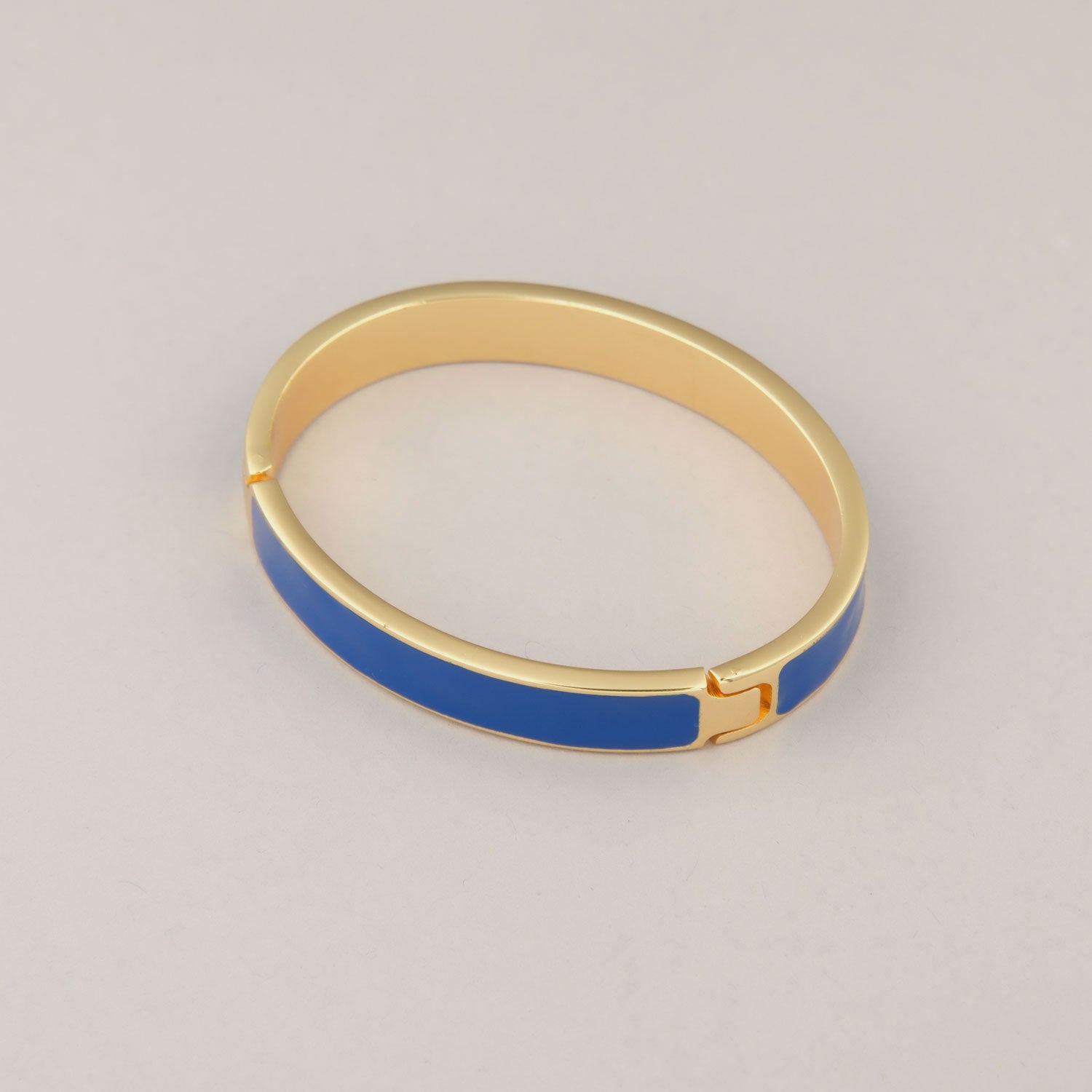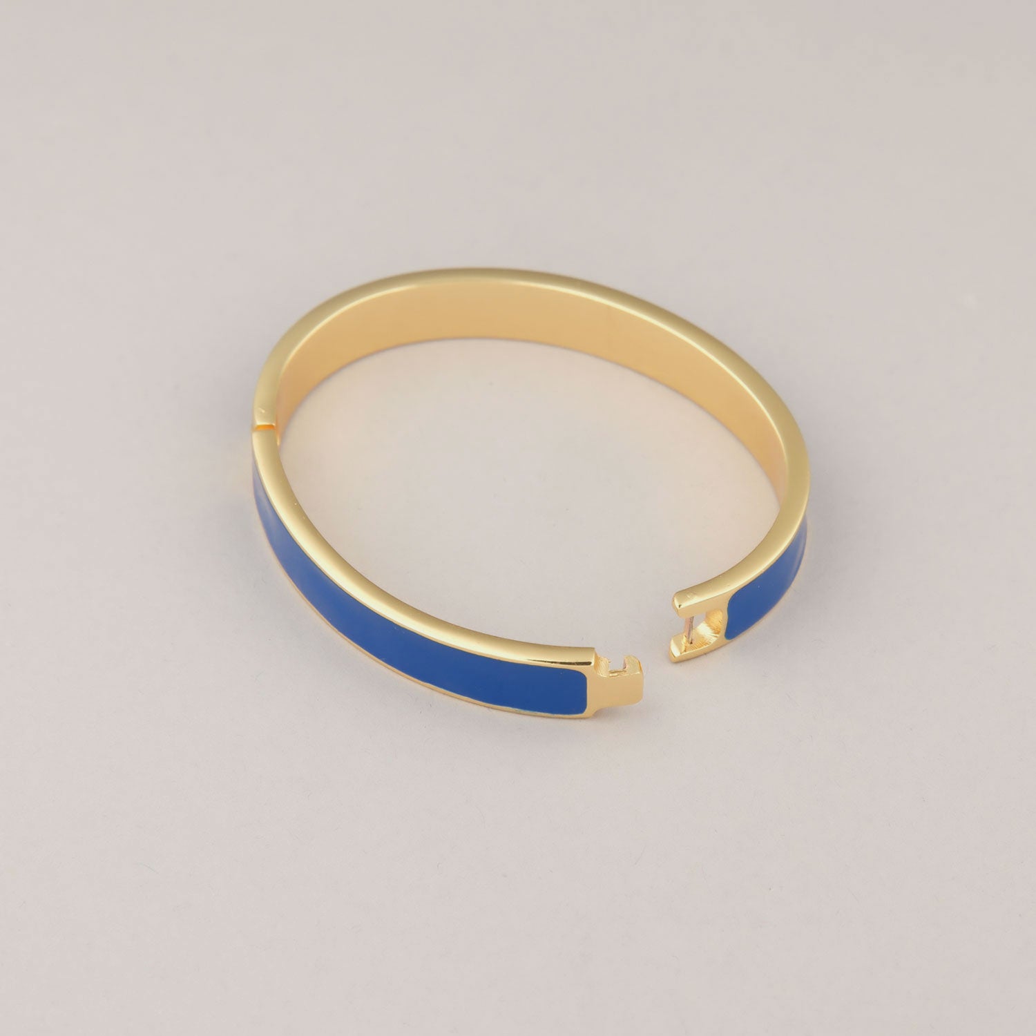 Bracciale a fascia realizzato a mano in ottone placcato oro 24 carati e smalto a freddo di colore blu elettrico con finitura trasparente. La fusione perfetta tra eleganza contemporanea e artigianato tradizionale. Lasciati affascinare dal design elegante ed i dettagli raffinati di un gioiello che sarà il complemento perfetto per ogni look. Si abbinerà perfettamente al tuo abito colorato, o sarà il tocco di stile che serve a un outfit più semplice. Il regalo perfetto per te stessa o per sorprendere una persona speciale.