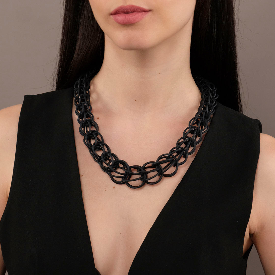 Collana a girocollo realizzata in stampa 3D. La tecnologia si fonde con l'eleganza. Tra le dita, indossa un anello originale grazie alla combinazione di design innovativo e materiali insoliti. La stampa 3D consente la precisione nei dettagli, la scelta dei materiali assicura leggerezza e comodità senza mai rinunciare a uno stile unico. Il regalo perfetto per chi ama i gioielli contemporanei, dal forte carattere sperimentale.