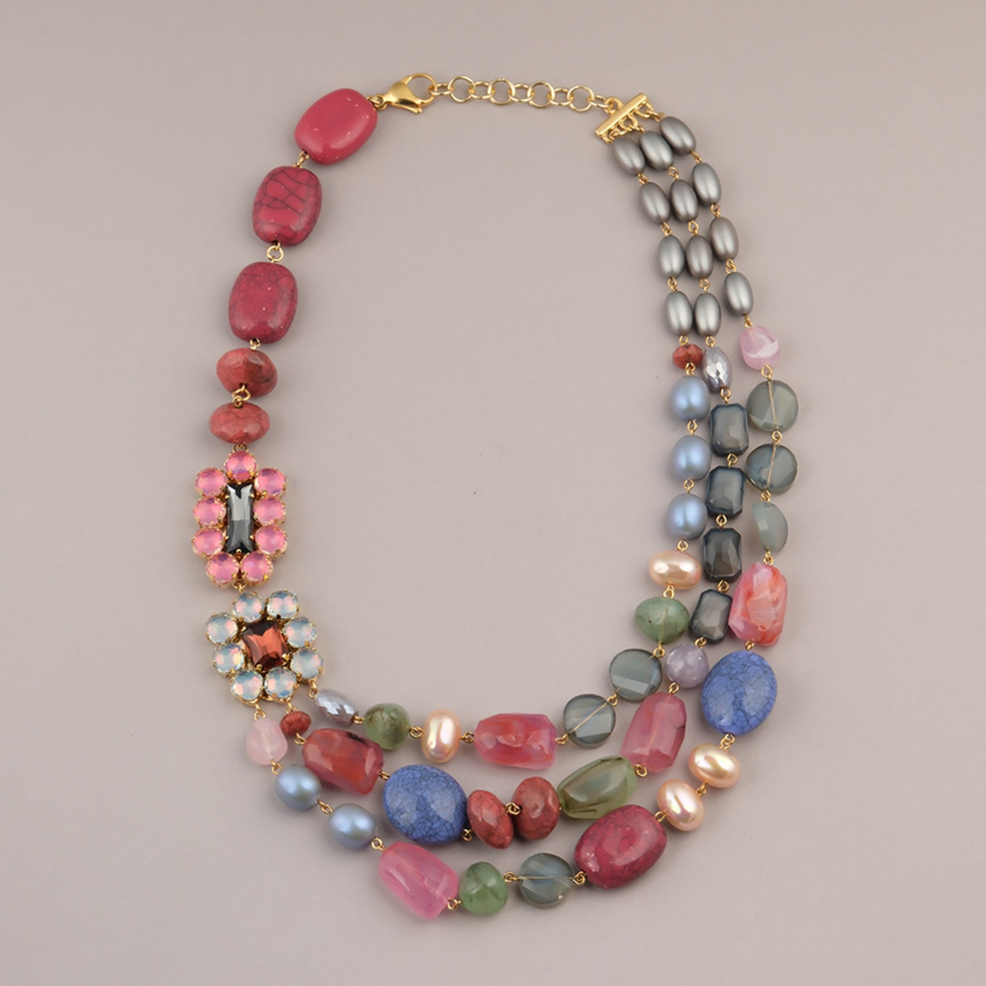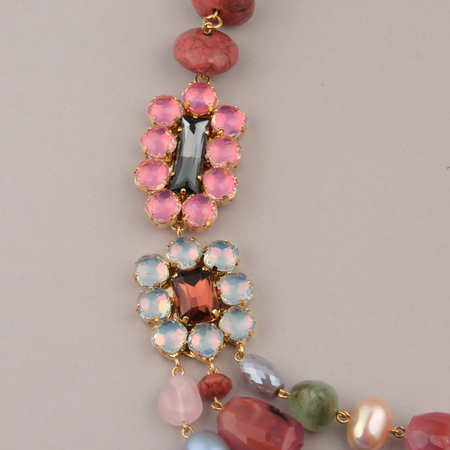 Collana a tre fili con perle in resina dalle delicate tonalità del magenta, azzurro, rosa e verde acqua con due elementi a forma di fiore realizzati con cristalli azzurri e rosa. Un gioiello essenziale e raffinato, che dona equilibrio e luce con la sua armonia discreta.