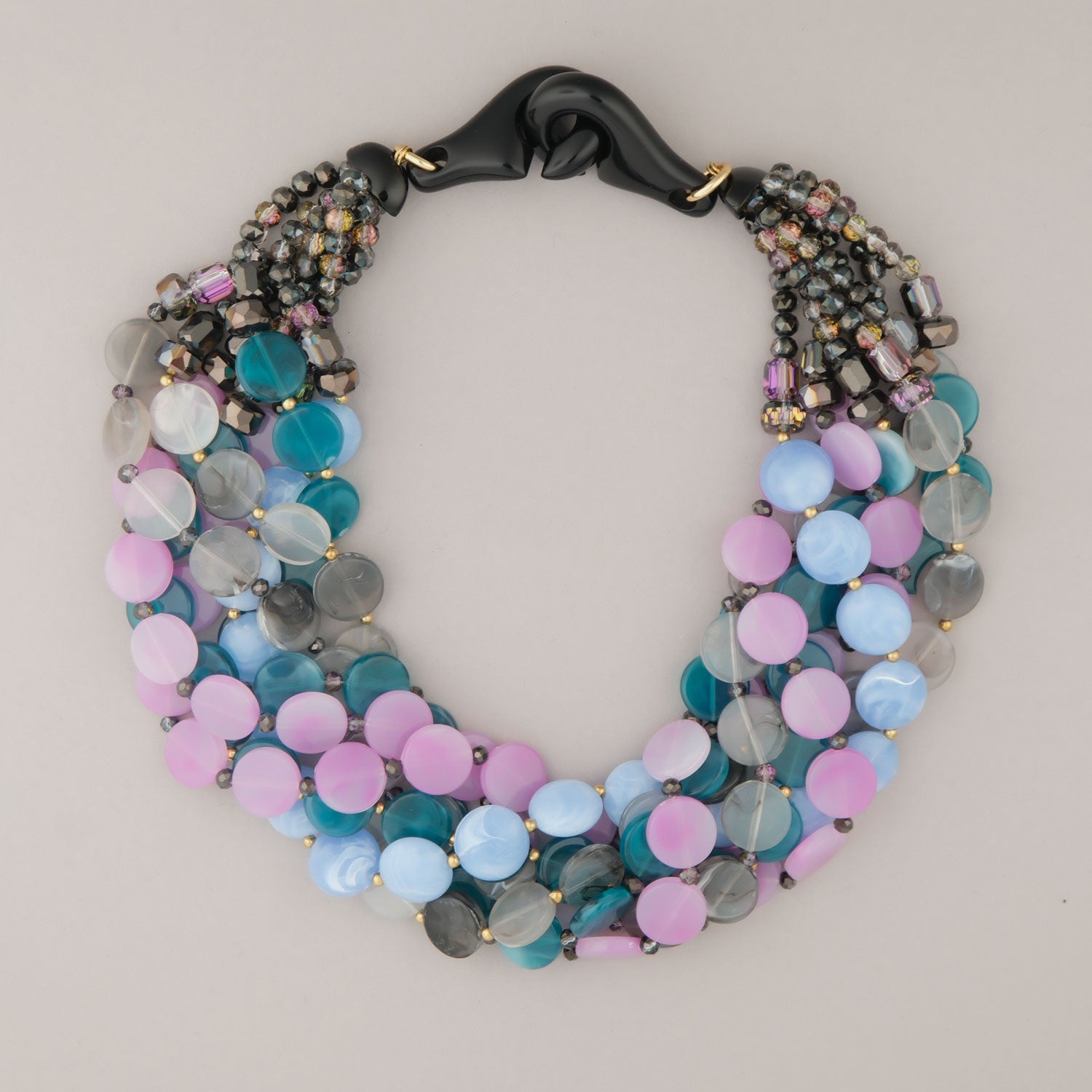 Girocollo multifili realizzato con pietre in resina dai colori nero, grigio, ottanio, azzurro e rosa. Dalla versatilità della resina nasce un gioiello dalla finitura trasparente e delicata, rimarrai sorpresa dalla luminosità che ti regalerà indossandolo.