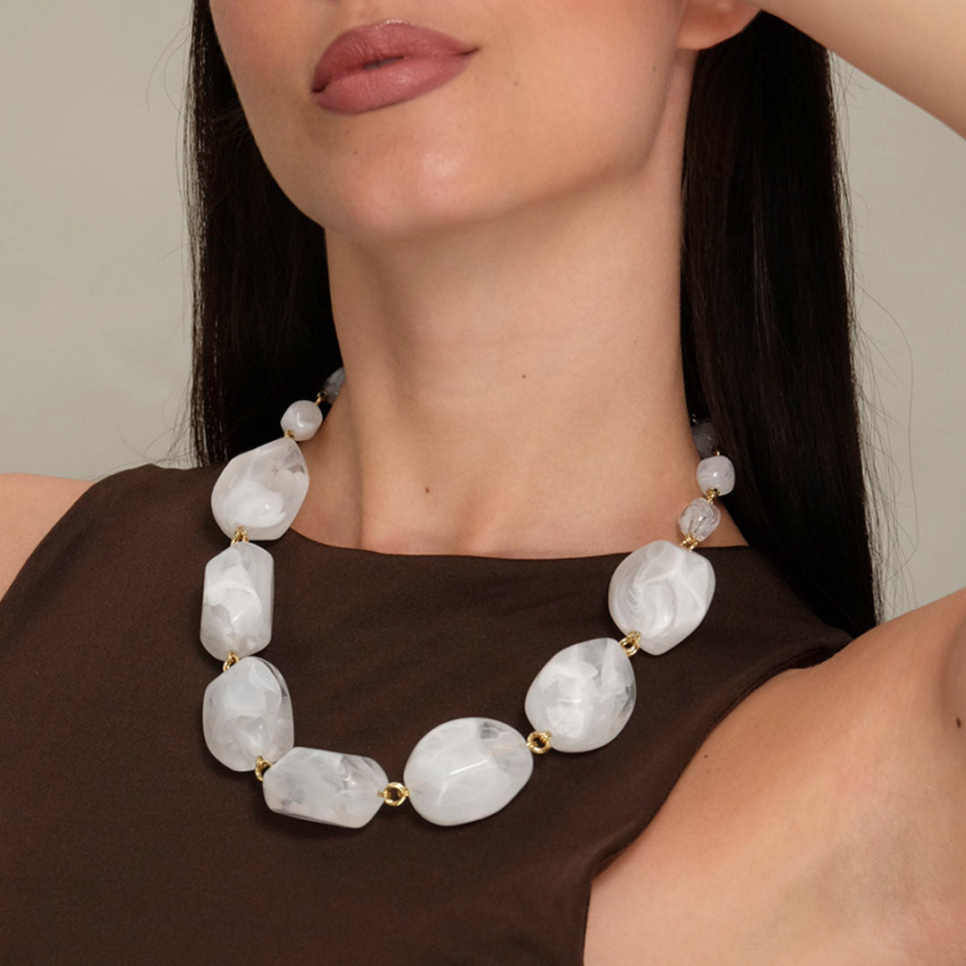 Collana a girocollo con catene in ottone dorato ed elementi in resina materica bianca dalla finitura opaca. La combinazione dei due materiali crea un look elegante e moderno, perfetto per le tue occasioni speciali.