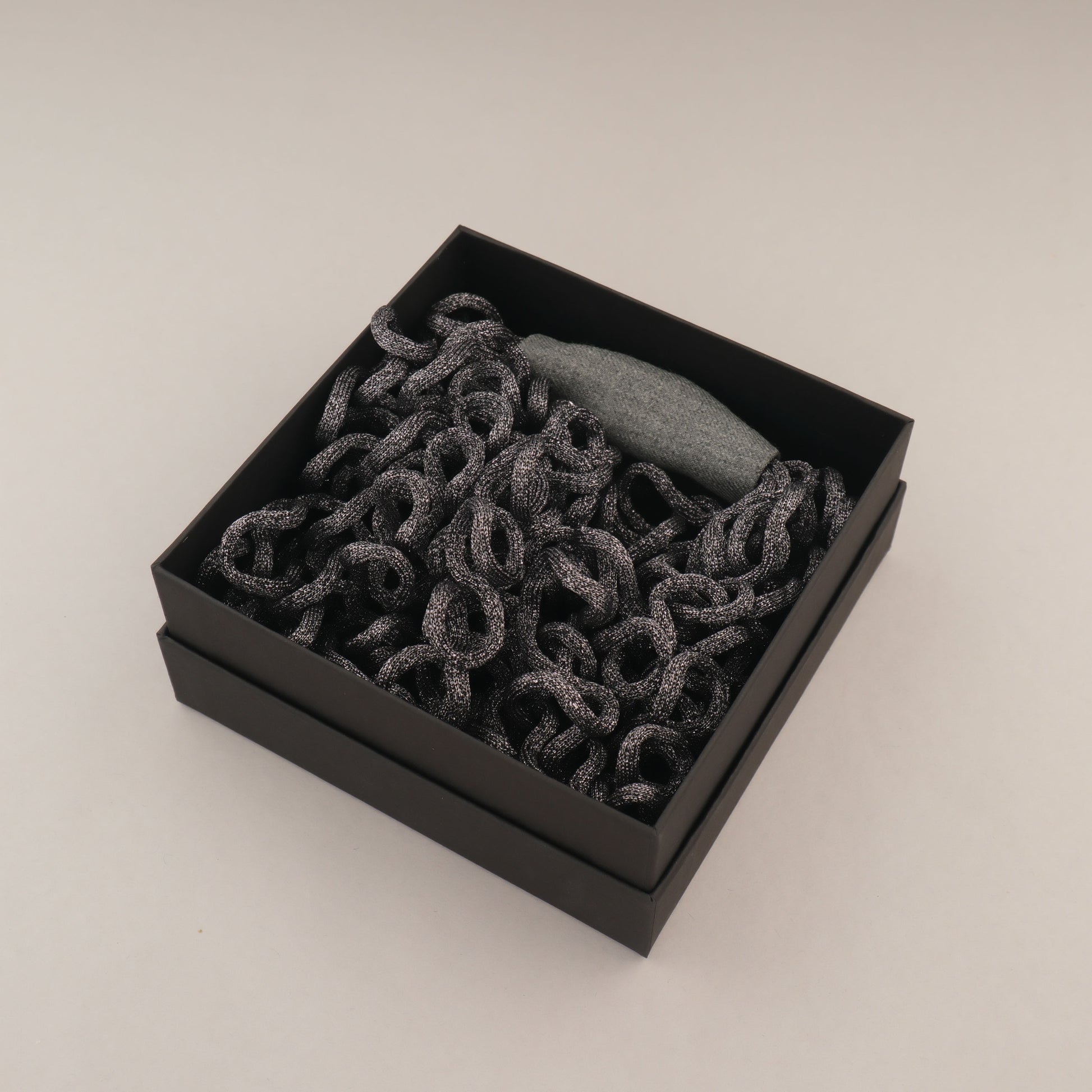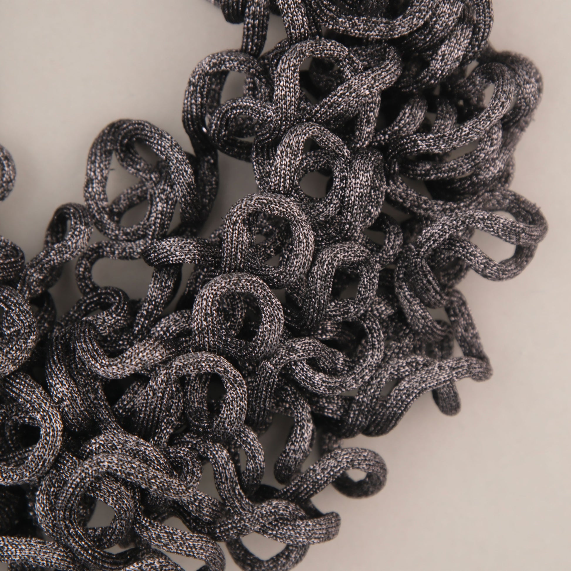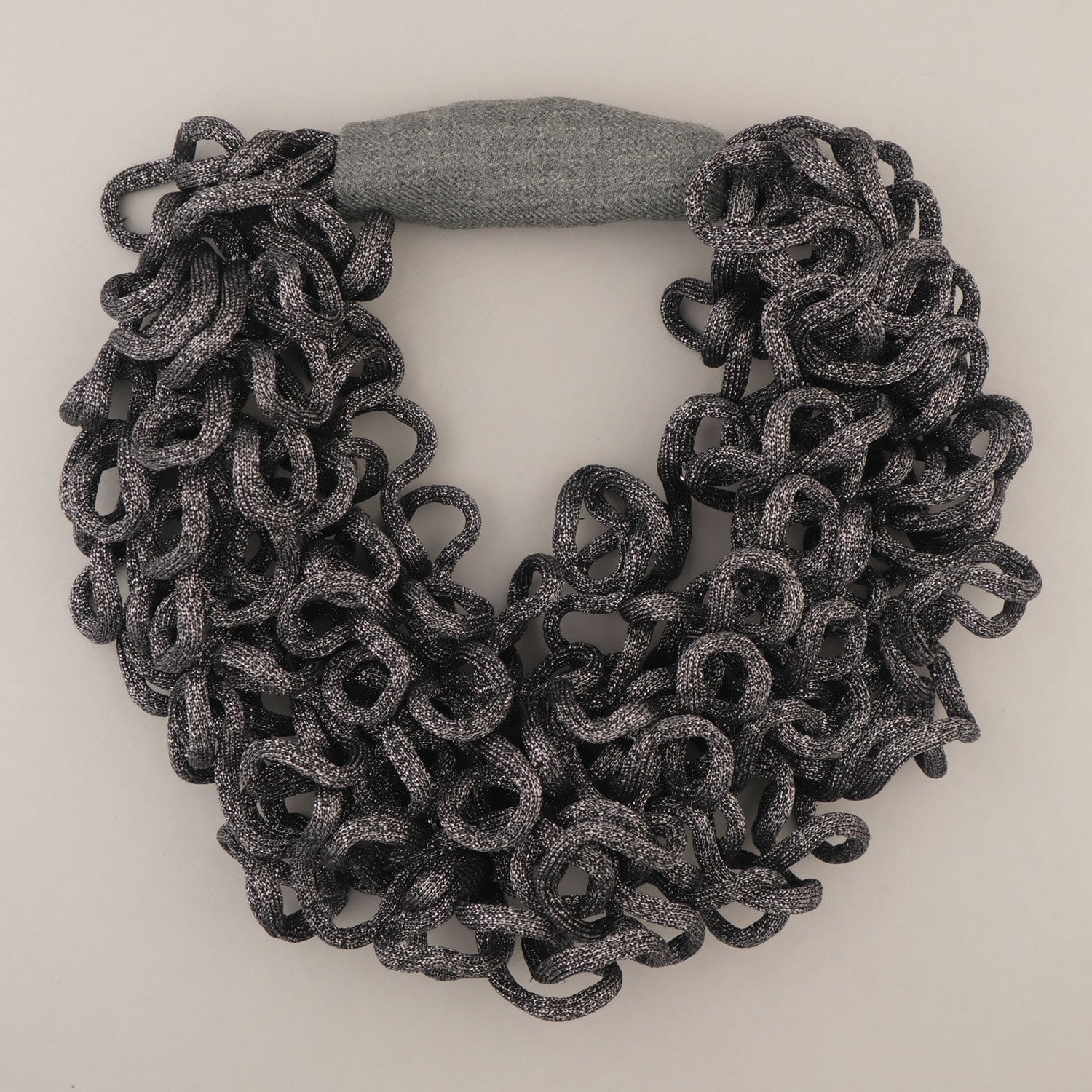 Girocollo realizzato a mano con cordini in tessuto di cotone elastico color argento brunito lurex. La chiusura è cucita dal lato posteriore, si infila comodamente dalla testa. Indossare una collana non è mai stato così facile, basta semplicemente infilarla dalla testa e giocare con i fili per donarle la forma che si desidera. Il cotone elastico permette di variare la lunghezza della collana, infatti sarà sufficiente l'ausilio delle mani per raccoglierla stringendo il girocollo oppure allungarla per donarle un aspetto meno vaporoso.