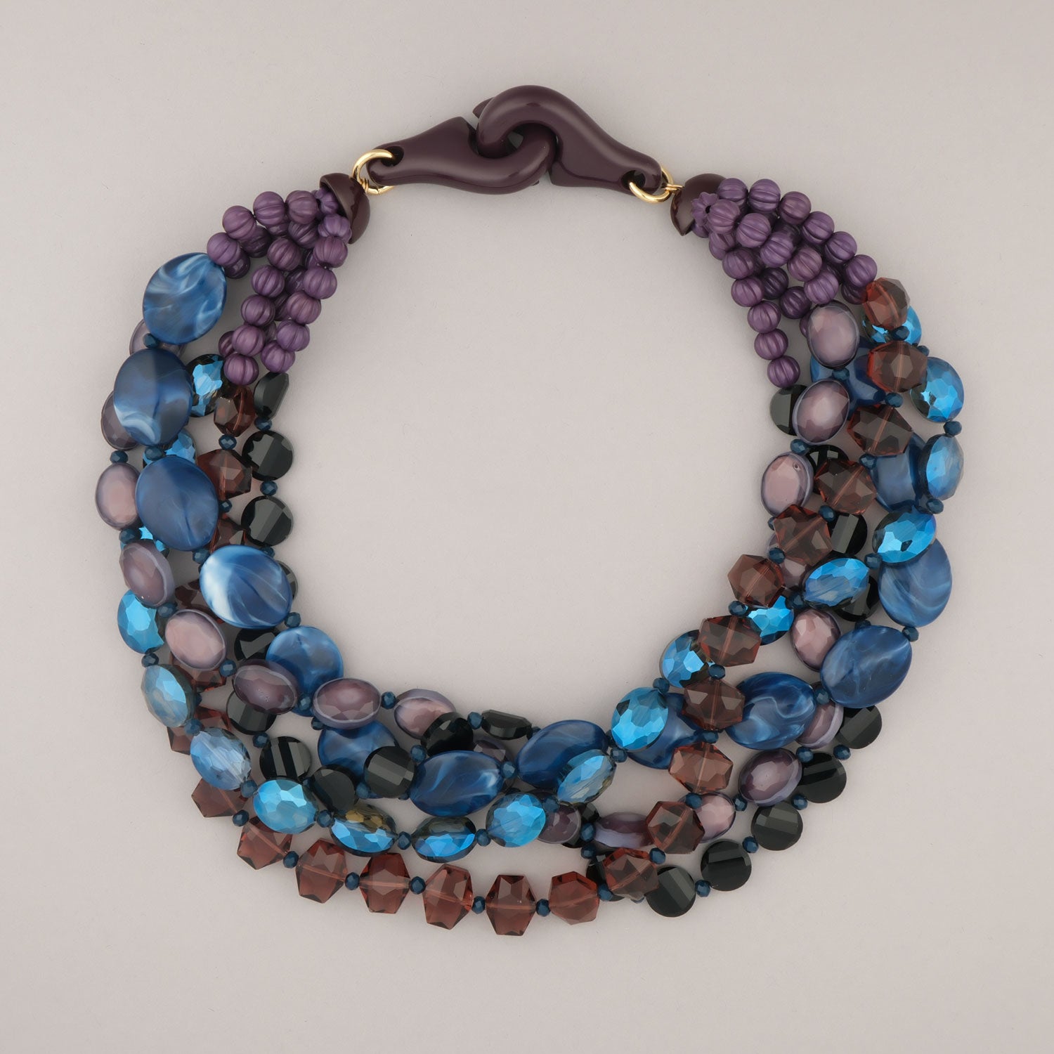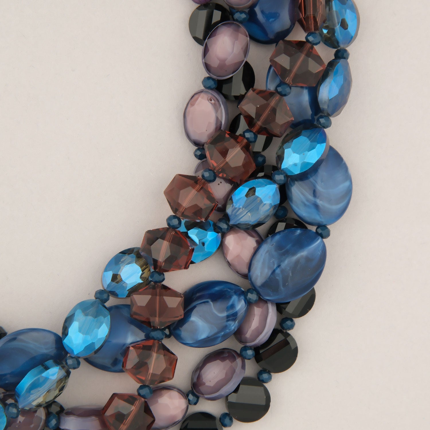 Girocollo multifili realizzato con pietre in cristallo e resina dalle diverse forme e sfumature sui toni del blu, viola e marrone. Un gioiello eccentrico e raffinato allo stesso tempo, per completare con eleganza i tuoi outfit.