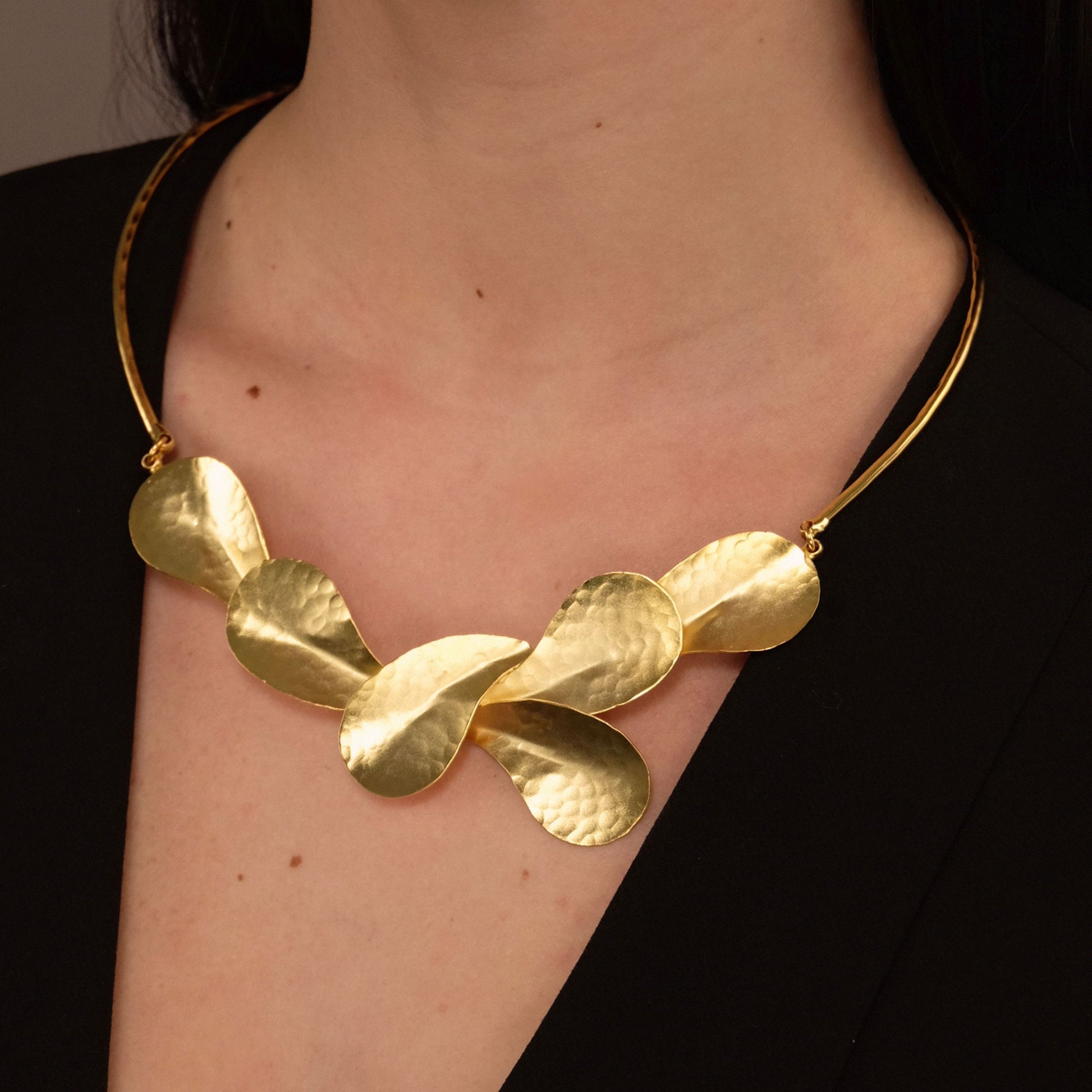 Girocollo in ottone placcato oro, nato dalla lavorazione di una lastra di metallo che, piega dopo piega, prende forme sempre diverse. Un accessorio pensato per accompagnare ogni donna, ogni giorno, in ogni versione di sé.