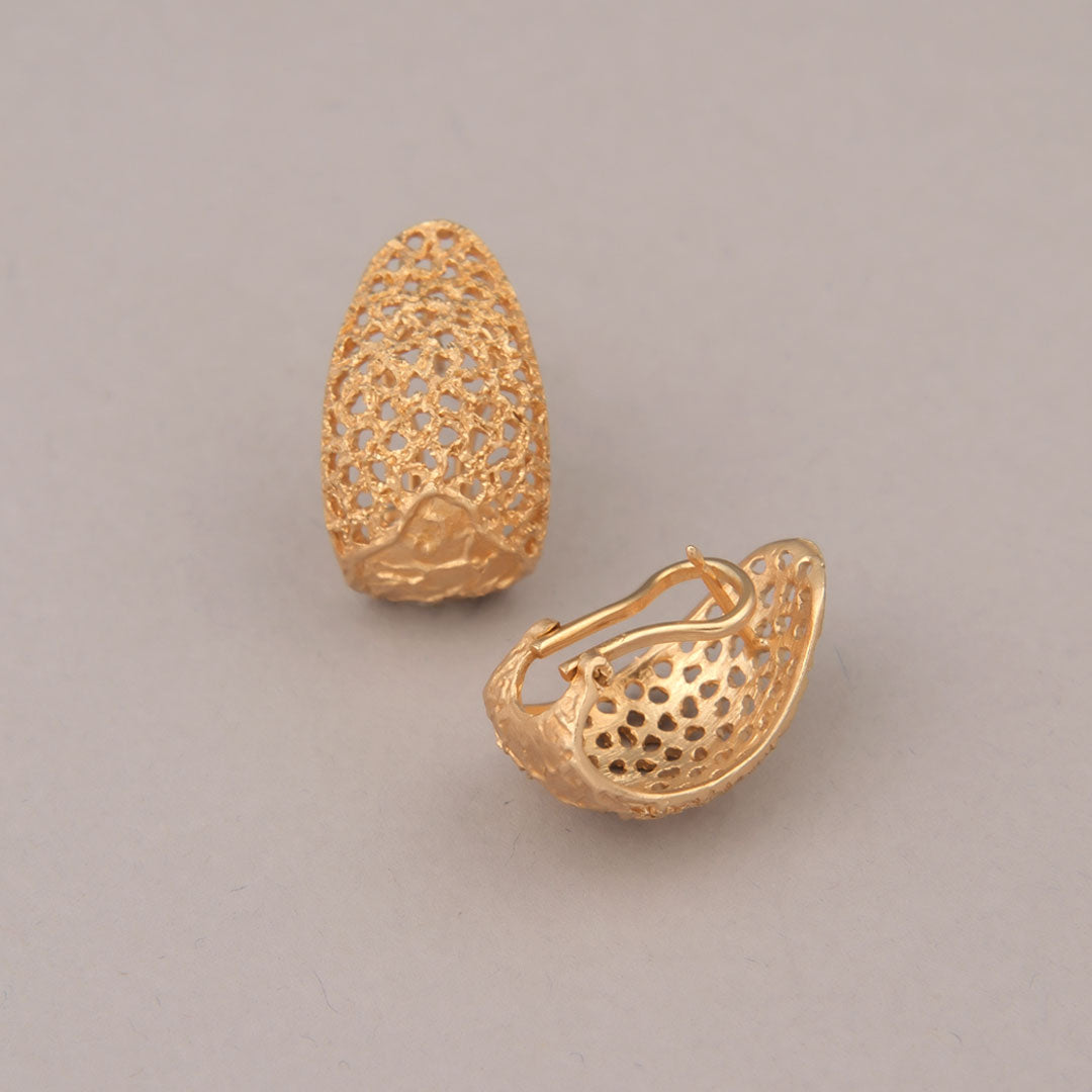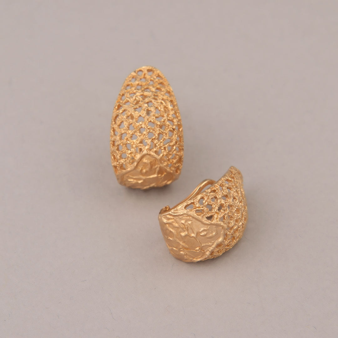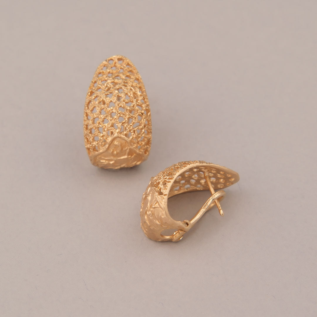 Orecchini a lobo in argento 925 placcato oro con finitura satinata e puntinata, quest’ultima permette di creare un effetto scintillante direttamente sul metallo. Un gioiello interamente realizzato a mano, dalla progettazione alla cura finale per ogni dettaglio.