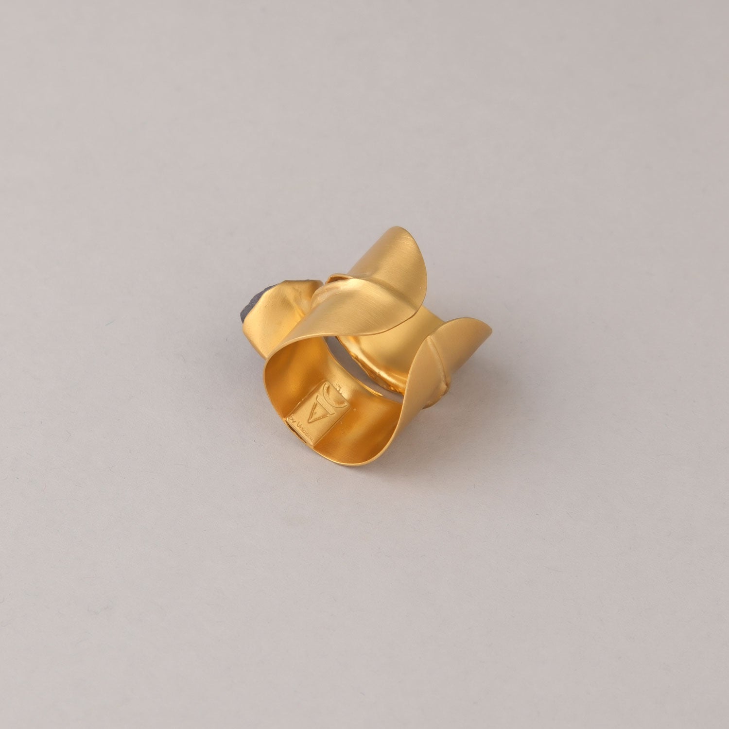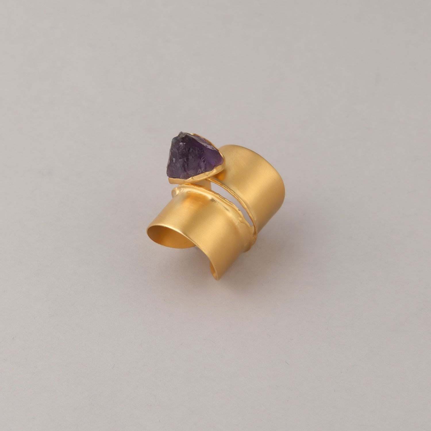 Anello a fascia in ottone placcato oro 24K con finitura opaca, inserto con ametista. Un accessorio per donare ancora più eleganza e raffinatezza ai tuoi gesti.