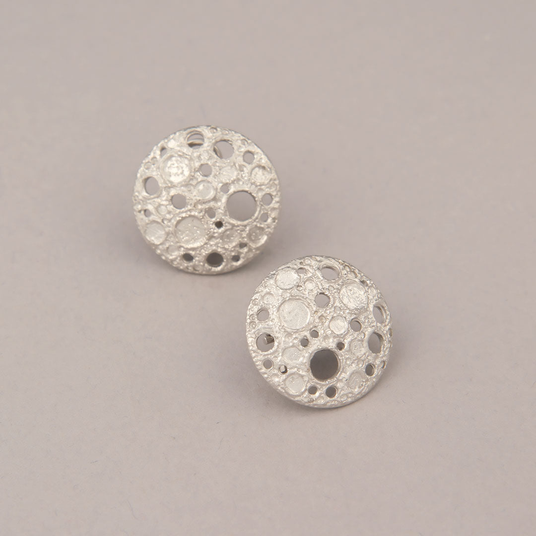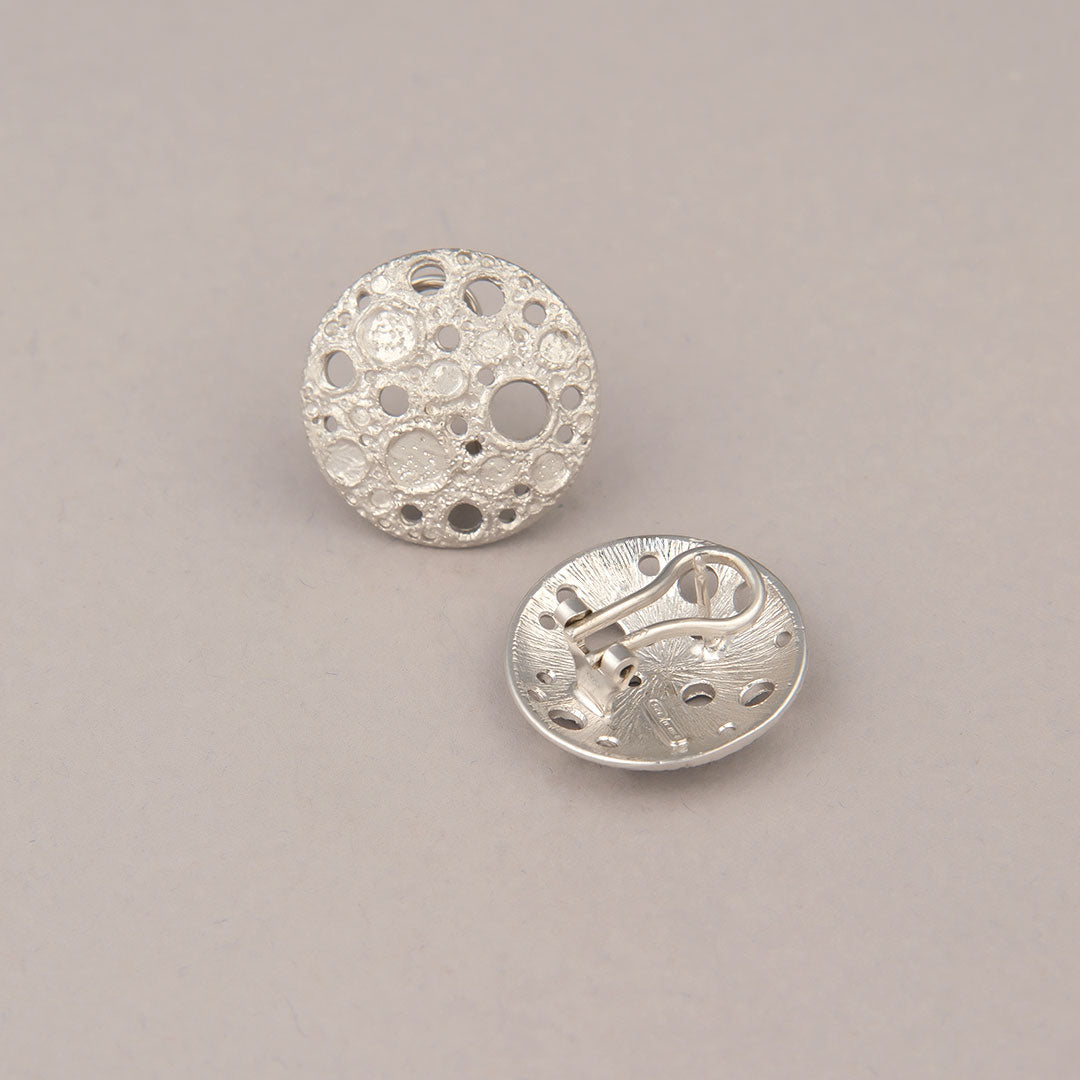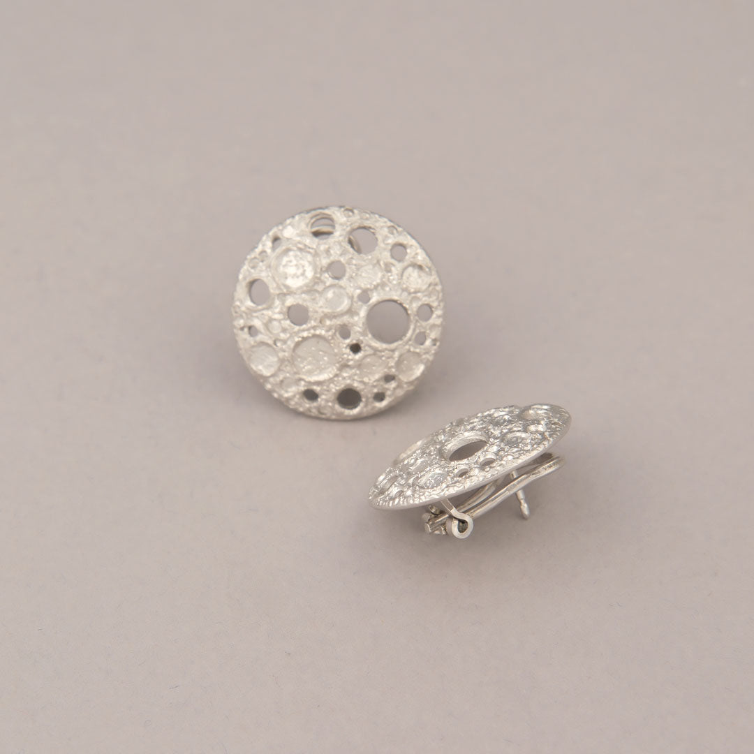 Orecchini a lobo in argento 925 con finitura satinata e puntinata, quest’ultima permette di creare un effetto scintillante direttamente sul metallo. Un gioiello interamente realizzato a mano, dalla progettazione alla cura finale per ogni dettaglio.