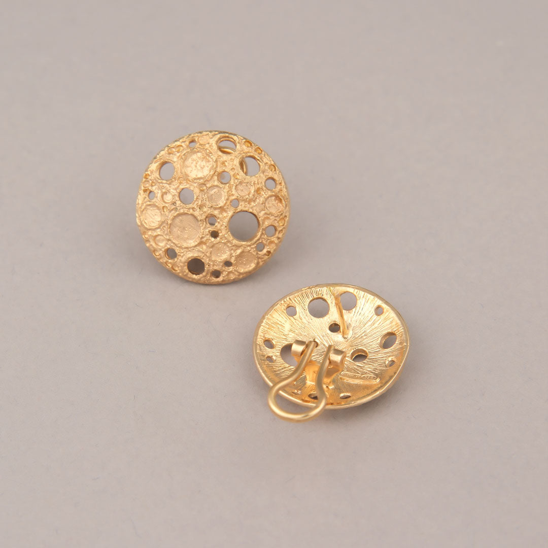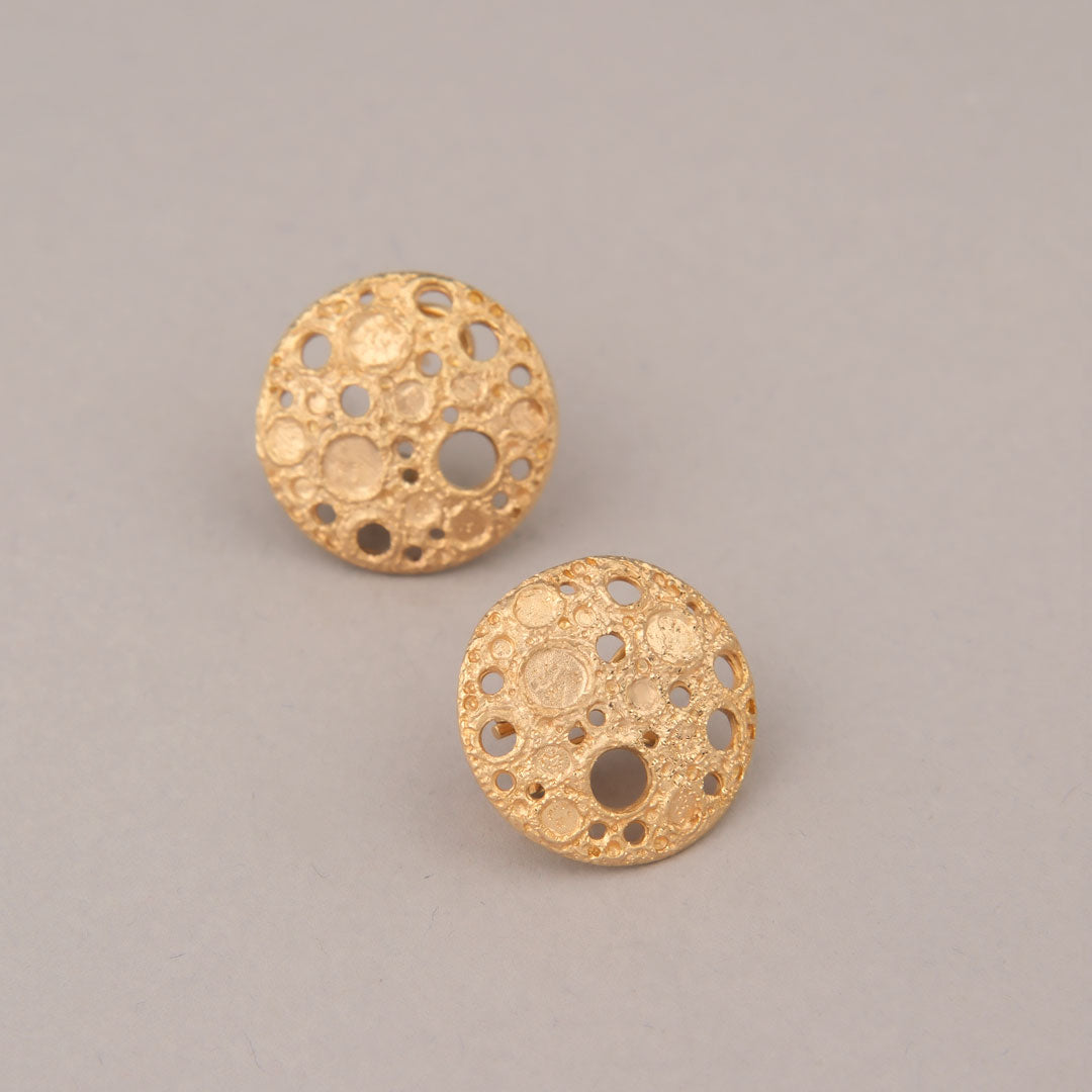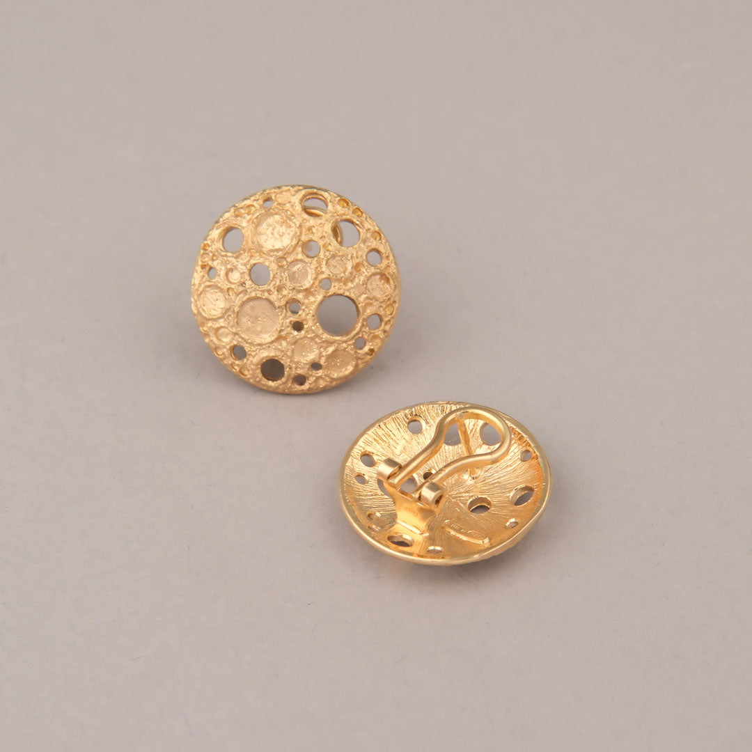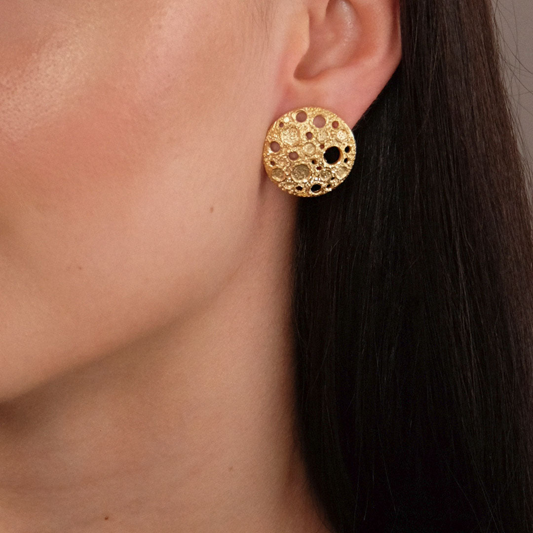 Orecchini a lobo in argento 925 dorato con finitura satinata e puntinata, quest’ultima permette di creare un effetto scintillante direttamente sul metallo. Un gioiello interamente realizzato a mano, dalla progettazione alla cura finale per ogni dettaglio.