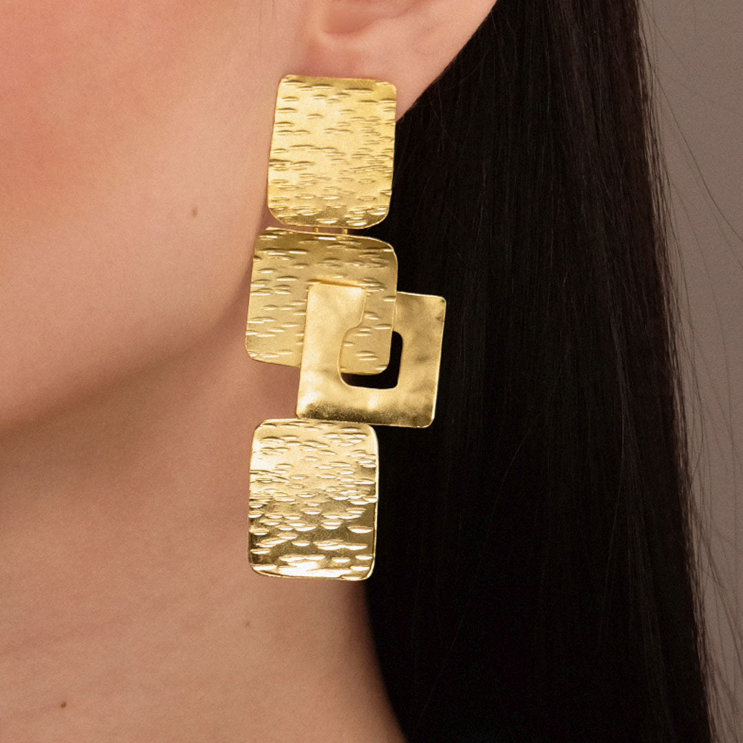Orecchini pendenti in ottone placcato oro, nati dalla lavorazione di una lastra di metallo che, piega dopo piega, prende forme sempre diverse. Un accessorio pensato per accompagnare ogni donna, ogni giorno, in ogni versione di sé.