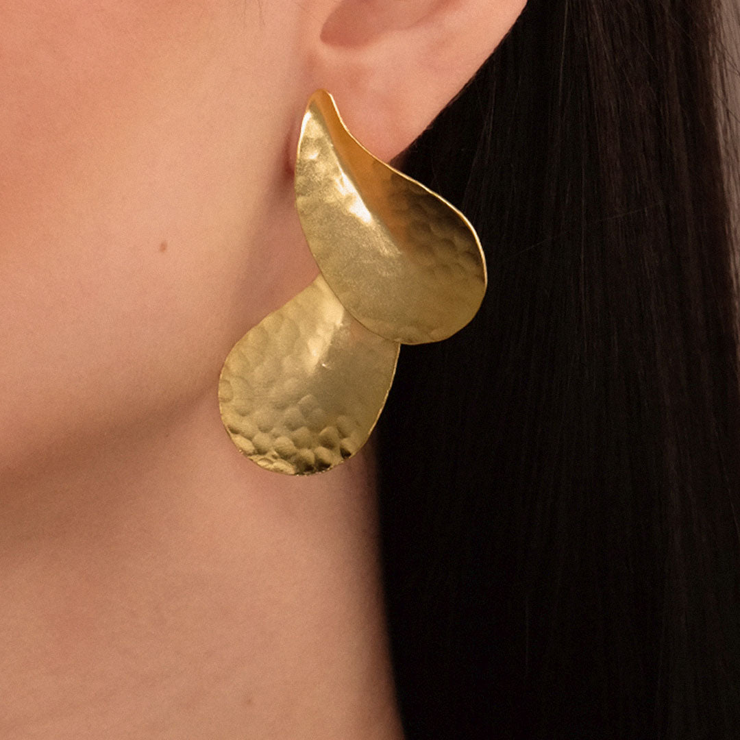 Orecchini pendenti in ottone placcato oro, nati dalla lavorazione di una lastra di metallo che, piega dopo piega, prende forme sempre diverse. Un accessorio pensato per accompagnare ogni donna, ogni giorno, in ogni versione di sé.