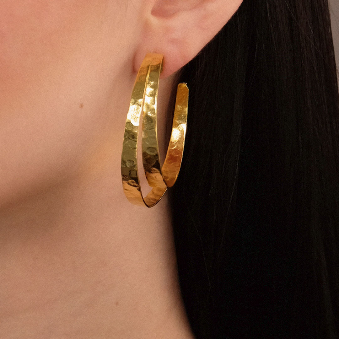 Orecchini a cerchio in ottone placcato oro, nati dalla lavorazione di una lastra di metallo che, piega dopo piega, prende forme sempre diverse. Un accessorio pensato per accompagnare ogni donna, ogni giorno, in ogni versione di sé.